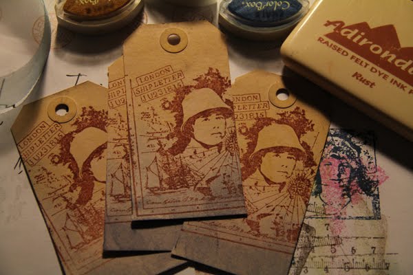 Att stämpla på tyg är riktigt, riktigt roligt. Snacka om att kunna göra användbara saker, till sig själv eller för att ge bort. Här har jag stämplat ”Lady 1877” på en bit tyg som jag sedan sytt fast på en väska jag sytt tidigare. Personligen gillar jag att göra bakgrunden i först en basgrundfärg och sen dutta med någon annan färg ovanpå för att få lite liv i det. När jag tittar på bilden nu så ser jag att det nästan ser medvetet ut, att det mörkare har hamnat utanför stämpeln och framhäver notpapprena, men det är det alltså inte.